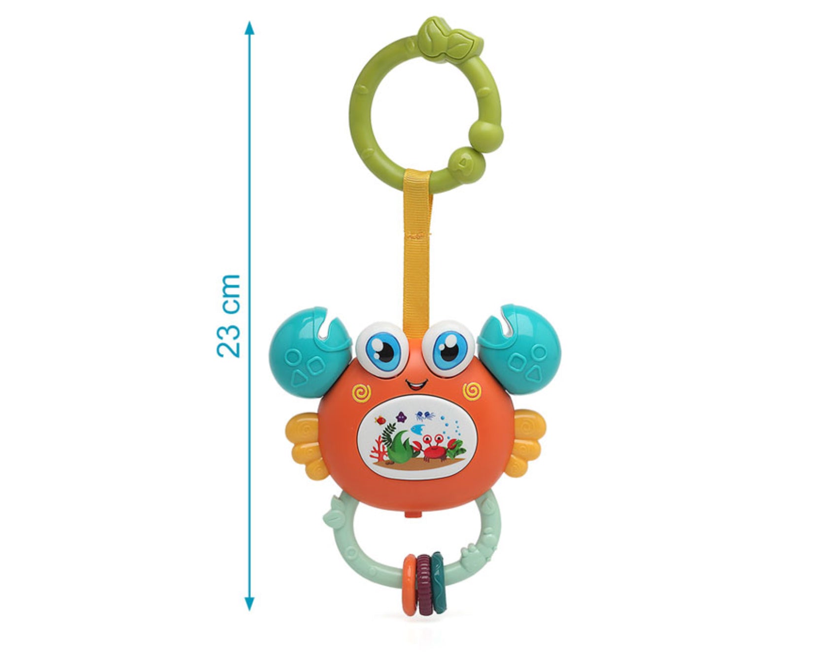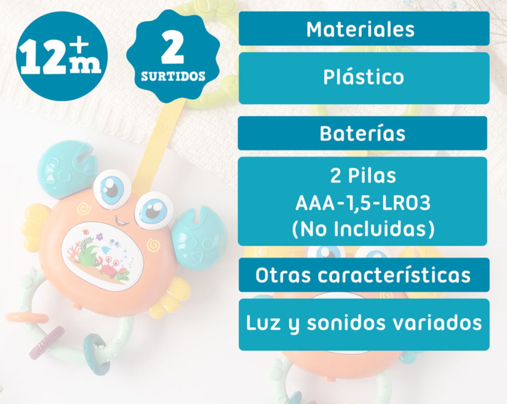 Este juguete es una excelente manera de estimular el desarrollo visual y táctil de los bebés, manteniéndolos entretenidos con su amigable diseño de cangrejo y sus divertidas actividades.
