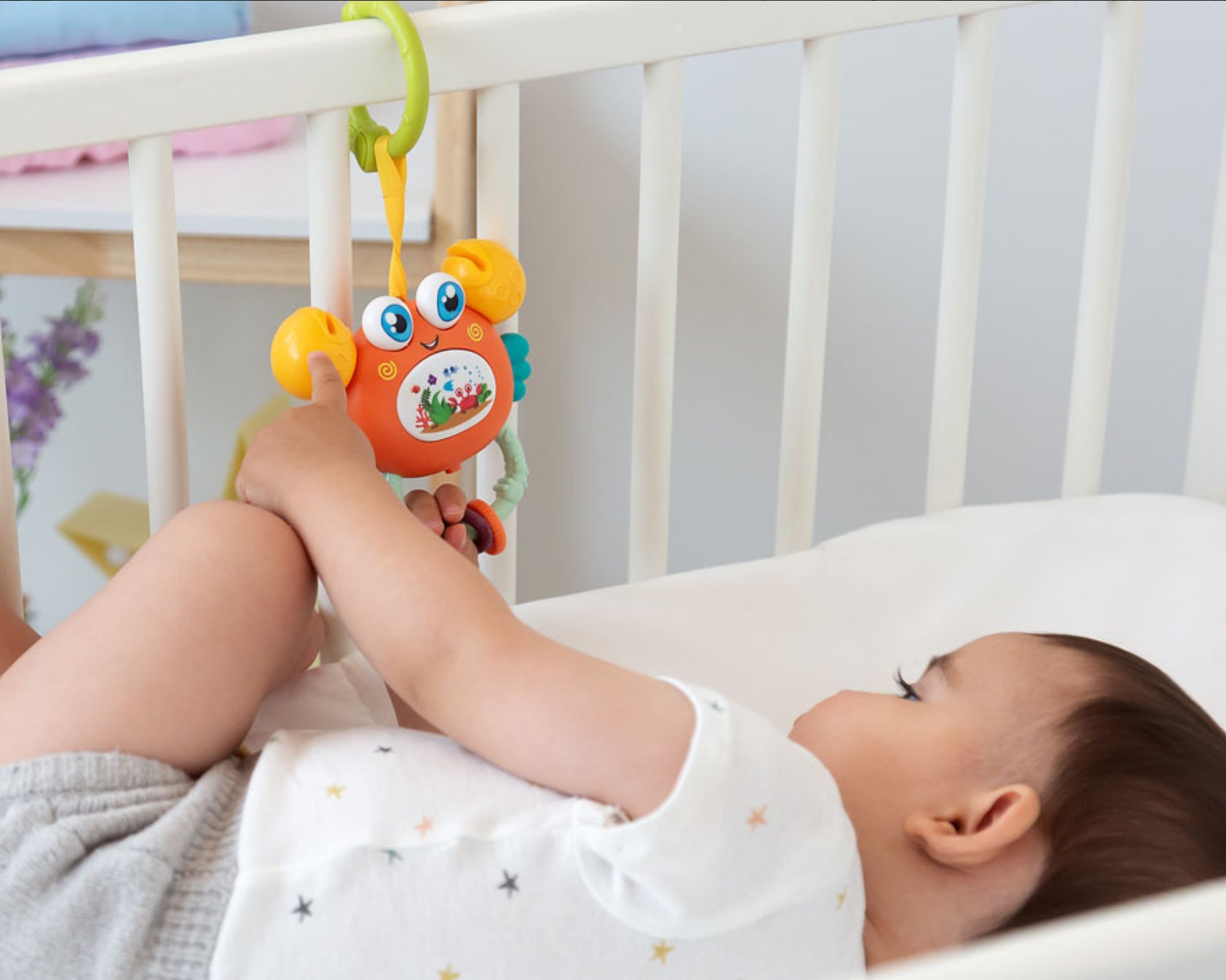 El juguete colgante de cangrejo Kiokids está diseñado para el entretenimiento y desarrollo sensorial de tu bebé.