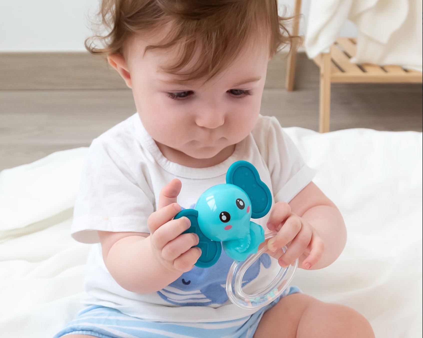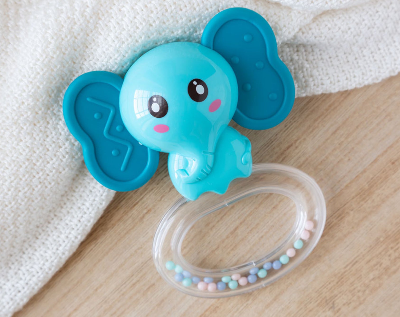 Nuestro mordedor-sonajero es un juguete perfecto para que juegue y pueda aliviar esas molestias de la dentición del bebé.